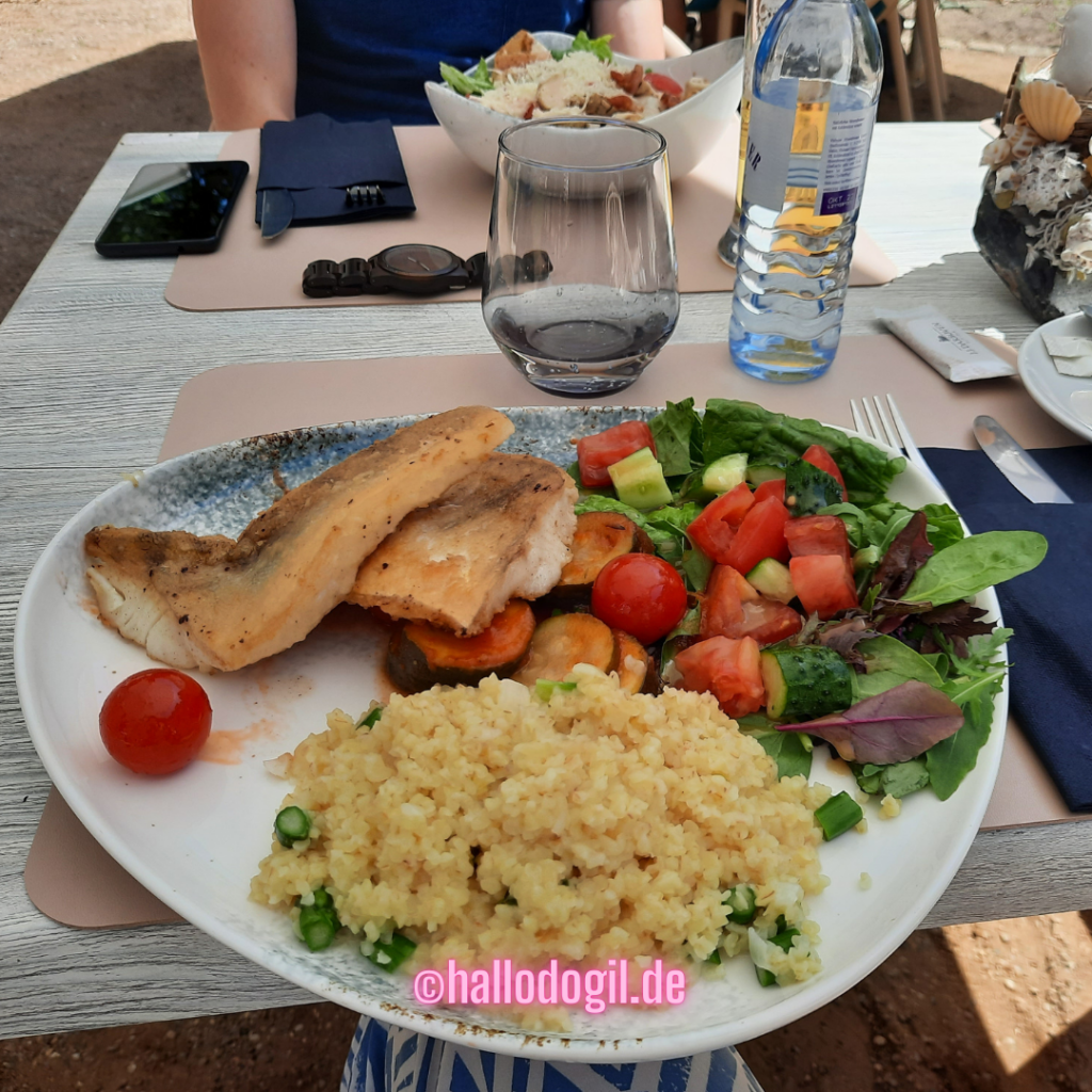 Mein Essen in Boltenhagen. Fisch mit Gemüse und Bulgur.