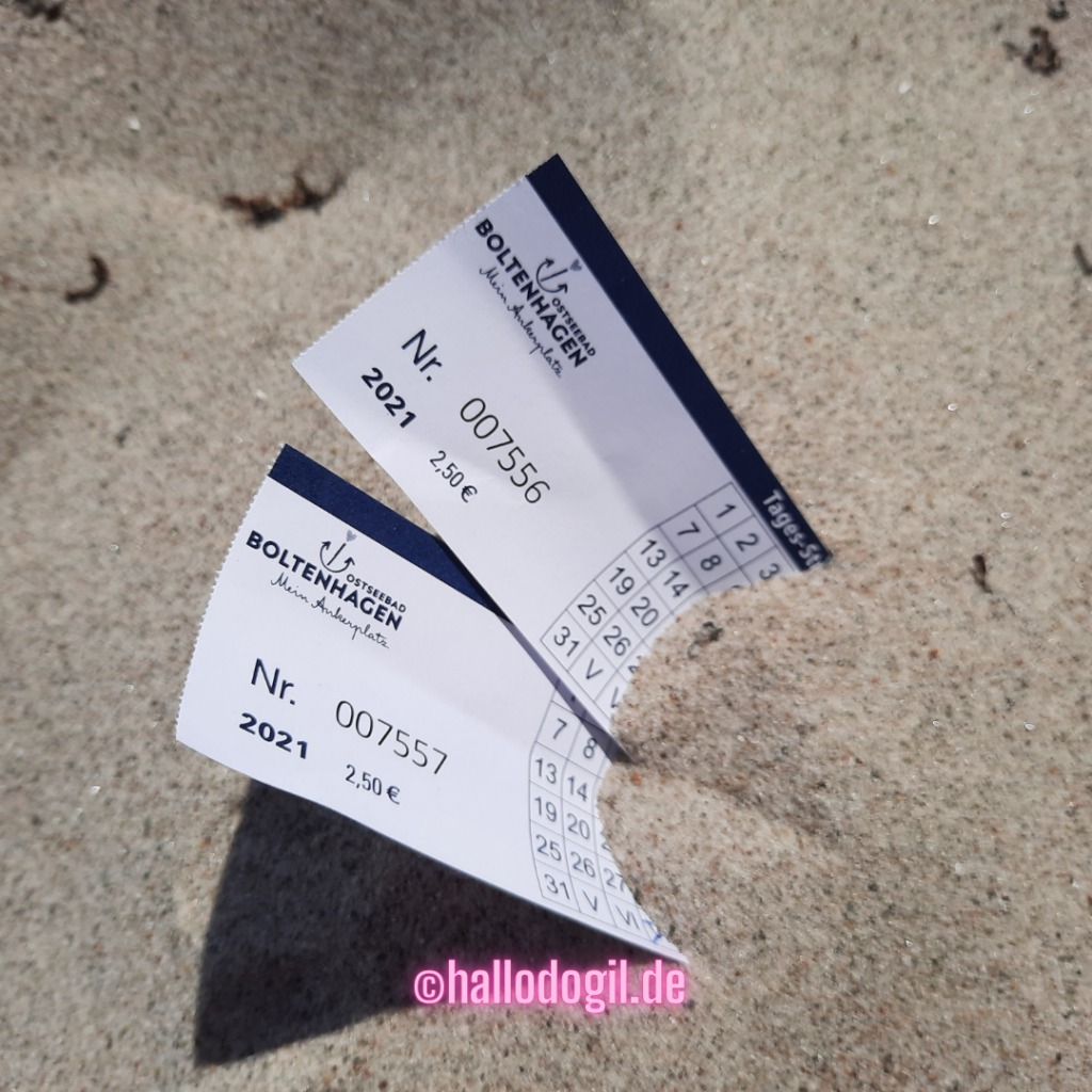 Tickets im Sand. Das sind die Kurkarten (Kurtaxen) für den Strandbesuch. 해변 방문 요금
